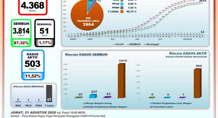 Perkembangan Pandemi Covid 19 di Provinsi Bali per Jumat (21/8) mencatat pertambahan kasus TERKONFIRMASI sebanyak 76 orang melalui Transmisi Lokal, kasus SEMBUH sebanyak 63 orang, dan 0 pasien Meninggal Dunia.
