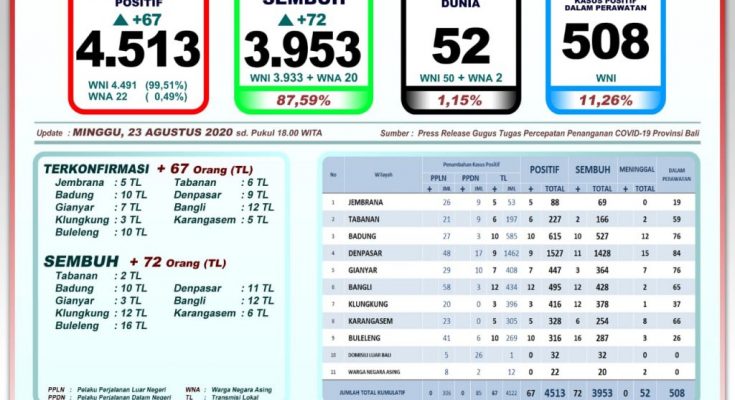 Perkembangan Pandemi Covid 19 di Provinsi Bali per Minggu (23/8) mencatat pertambahan kasus TERKONFIRMASI sebanyak 67 orang melalui Transmisi Lokal, kasus SEMBUH sebanyak 72 orang, dan 0 pasien Meninggal Dunia.