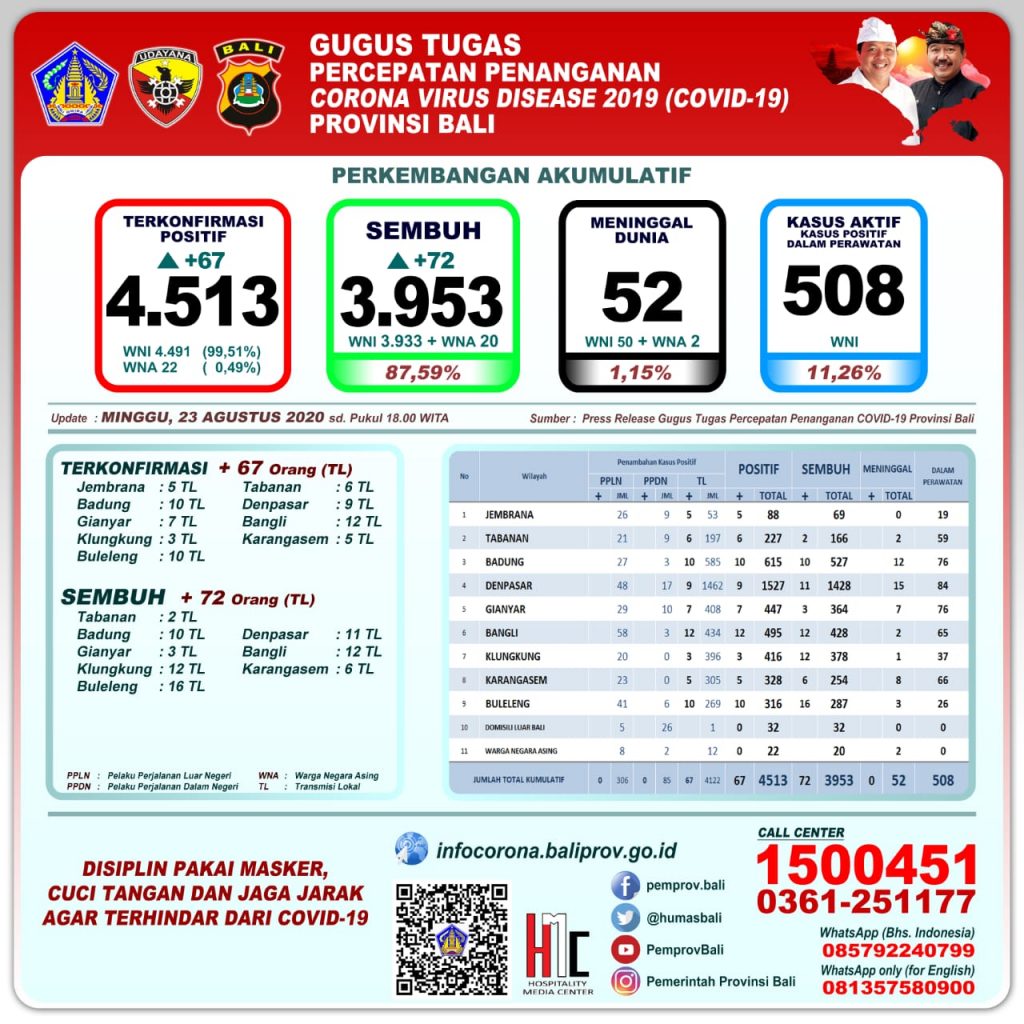 Perkembangan Pandemi Covid 19 di Provinsi Bali per Minggu (23/8) mencatat pertambahan kasus TERKONFIRMASI sebanyak 67 orang melalui Transmisi Lokal, kasus SEMBUH sebanyak 72 orang, dan 0 pasien Meninggal Dunia.