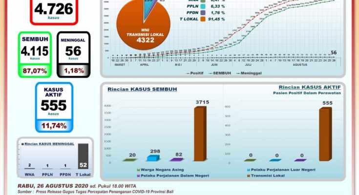 Perkembangan Pandemi Covid 19 di Provinsi Bali per Rabu (26/8) mencatat pertambahan kasus TERKONFIRMASI sebanyak 76 orang melalui Transmisi Lokal, kasus SEMBUH sebanyak 57 orang, dan 2 pasien Covid-19 Meninggal Dunia.