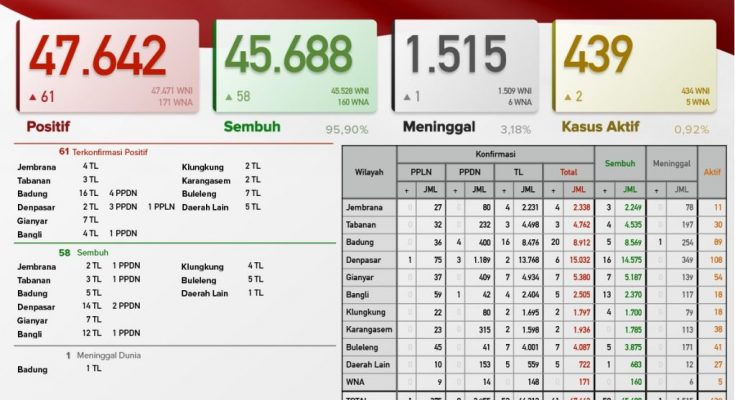 TERKONFIRMASI sebanyak 61 orang (61 orang melalui Transmisi Lokal, SEMBUH sebanyak 58 orang dan 1 pasien yang meninggal dunia).