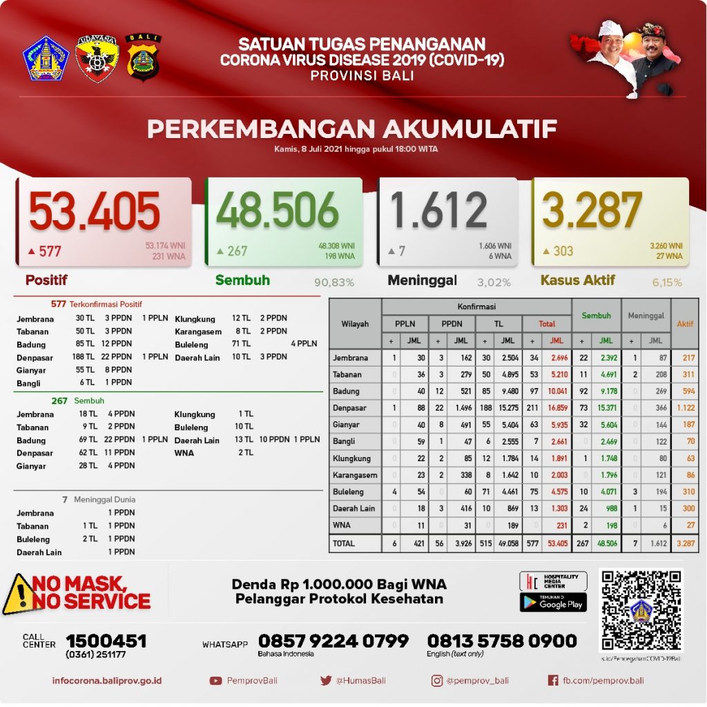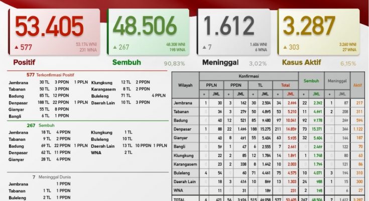 TERKONFIRMASI 53.405 orang, SEMBUH 48.506 orang (90,83%), dan Meninggal Dunia 1.612 orang (3,02%).