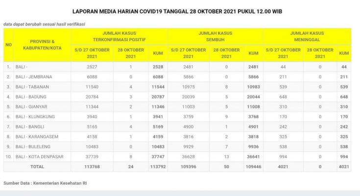 Untuk mencegah penyebaran virus Covid-19, Gubernur Bali telah menerbitkan Surat Edaran Nomor 18 Tahun 2021 Tentang Pemberlakuan Pembatasan Kegiatan Masyarakat (PPKM) Corona Virus Disease 2019 Dalam Tatanan Kehidupan Era Baru Di Provinsi Bali. Surat Edaran ini mulai berlaku pada hari Kamis tanggal 7 Oktober 2021 sampai dengan pemberitahuan lebih lanjut.