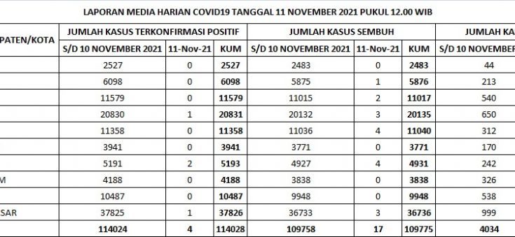 TERKONFIRMASI sebanyak 4 orang, SEMBUH sebanyak 17 orang dan 0 pasien meninggal dunia.