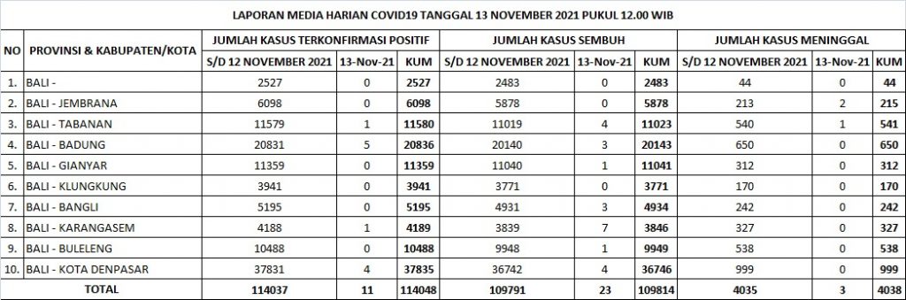 Seluruh Kabupaten / Kota berada pada Zona Kuning / Risiko Rendah (8 Kabupaten dan 1 Kota) : Kabupaten Badung, Gianyar, Bangli, Jembrana, Klungkung, Karangasem, Tabanan, Buleleng, dan Kota Denpasar.