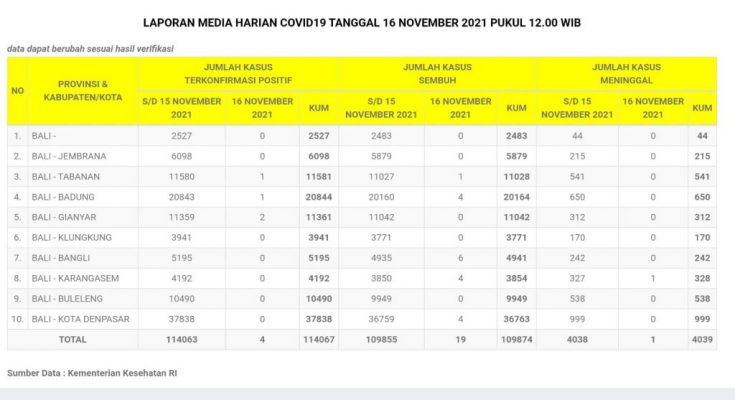 Seluruh Kabupaten / Kota berada pada Zona Kuning / Risiko Rendah (8 Kabupaten dan 1 Kota) : Kabupaten Badung, Gianyar, Bangli, Jembrana, Klungkung, Karangasem, Tabanan, Buleleng, dan Kota Denpasar.