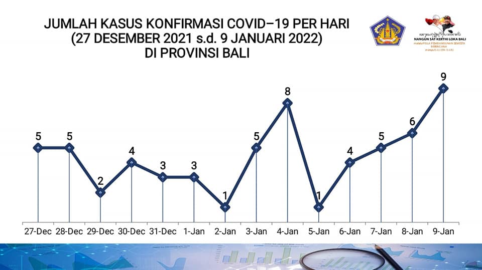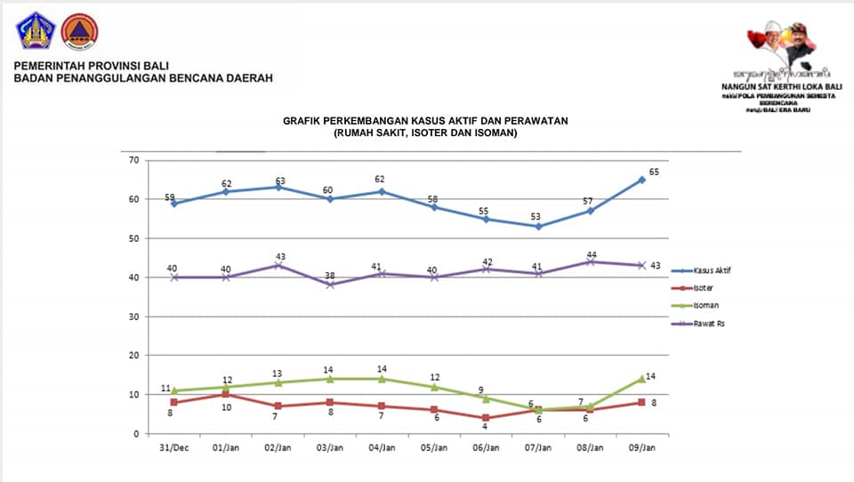 Sebagai informasi, perkembangan terbaru per hari Minggu 9 Januari 2022, Satgas Covid 19 Provinsi Bali mencatat ada 65 kasus aktif di Bali. Dari data tersebut 43 orang menjalani perawatan di RS Rujukan, 8 orang melakukan isolasi terpusat dan 14 lainnya menjalani isolasi mandiri.
