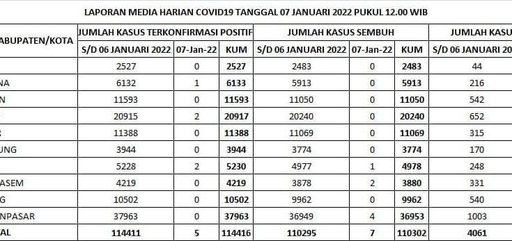 TERKONFIRMASI sebanyak 5 orang, SEMBUH sebanyak 7 orang dan 0 pasien meninggal dunia.