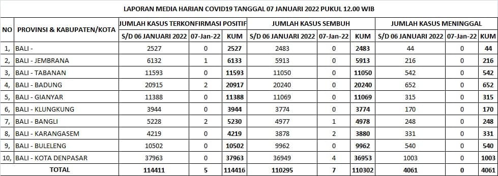 TERKONFIRMASI sebanyak 5 orang, SEMBUH sebanyak 7 orang dan 0 pasien meninggal dunia.