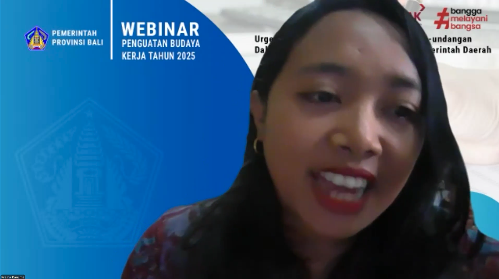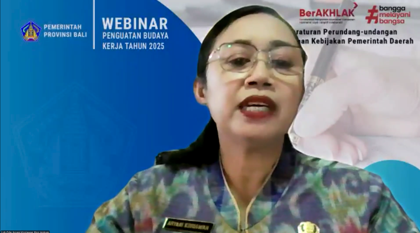 Selasa, 24 Juni 2025 Biro Hukum Sekretariat Daerah Provinsi Bali melaksanakan Webinar Penguatan Budaya Kerja dengan tema “Urgensi Penyusunan Peraturan Perundang-Undangan Dalam Rangka Pelaksanaan Kebijakan Daerah”. Kegiatan webinar ini diinisiasi oleh Biro Organisasi dimana Perangkat Daerah di Lingkungan Pemerintah Provinsi Bali secara bergiliran sebagai pemateri webinar dengan tema yang sudah ditentukan sebelumnya. Pada webinar ini Kepala Bagian Peraturan Perundang-Undangan Provinsi, Ibu Luh Gde Aryani Koriawan ditunjuk sebagai narasumber serta Analis Produk Hukum, Putu Pramayuni Karisma Devi ditunjuk sebagai moderator.
