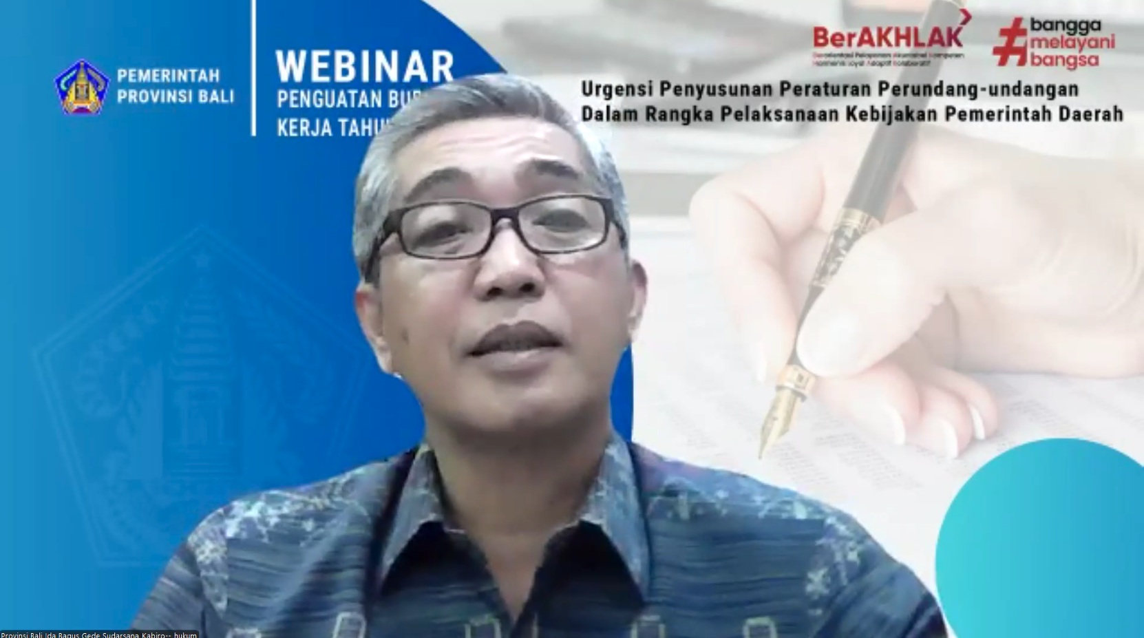 Selasa, 24 Juni 2025 Biro Hukum Sekretariat Daerah Provinsi Bali melaksanakan Webinar Penguatan Budaya Kerja dengan tema “Urgensi Penyusunan Peraturan Perundang-Undangan Dalam Rangka Pelaksanaan Kebijakan Daerah”. Kegiatan webinar ini diinisiasi oleh Biro Organisasi dimana Perangkat Daerah di Lingkungan Pemerintah Provinsi Bali secara bergiliran sebagai pemateri webinar dengan tema yang sudah ditentukan sebelumnya. Pada webinar ini Kepala Bagian Peraturan Perundang-Undangan Provinsi, Ibu Luh Gde Aryani Koriawan ditunjuk sebagai narasumber serta Analis Produk Hukum, Putu Pramayuni Karisma Devi ditunjuk sebagai moderator.