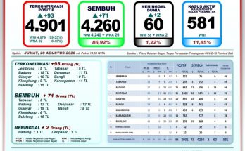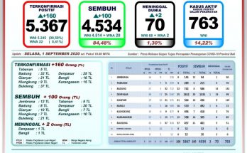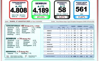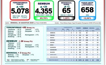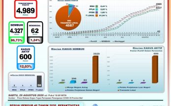 Perkembangan Pandemi Covid 19 di Provinsi Bali per hari ini mencatat pertambahan kasus TERKONFIRMASI sebanyak 169 orang melalui Transmisi Lokal, kasus SEMBUH sebanyak 101 orang, dan 5 pasien terkonfirmasi Meninggal …