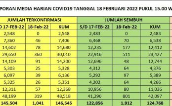 Update Penanggulangan Covid-19, Minggu, 27 Februari 2022 Pertambahan kasus hari ini sebagai berikut : TERKONFIRMASI sebanyak 332 orang, SEMBUH sebanyak 1.527 orang dan 10 pasien meninggal dunia. Rincian Data Kasus …