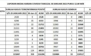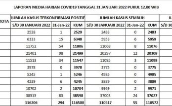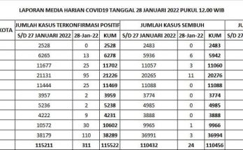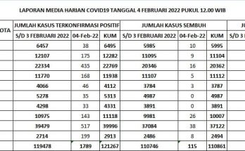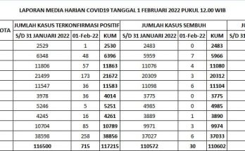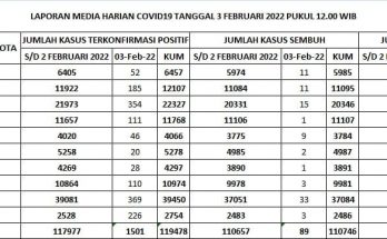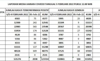 Update Penanggulangan Covid-19, Minggu, 6 Februari 2022. Pertambahan kasus hari ini sebagai berikut : TERKONFIRMASI sebanyak 1.918 orang, SEMBUH sebanyak 196 orang dan 7 pasien meninggal dunia. Rincian Data Kasus …